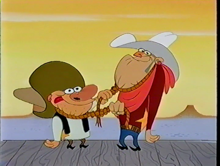 - A brief shot of Abner and Ewalt throwing nooses around their necks that plays while before and during the song (Plays when they say "So get yourself a lasso and decorate your neck" and the footage is substituted with reused footage of Stimpy stomping his foot at the beginning of the song.) is trimmed in most versions of the episode. This edit, like the other one, is also corrected on the TNN/Spike TV version.