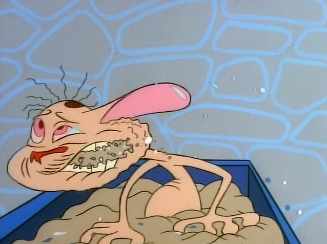 In "Ren's Pecs", Ren is bullied by a large muscle man who kicked litter on to Ren's face from Stimpy's litter box.